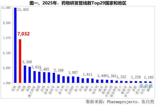 2025年,在有活跃药物研发项目(药物研发管线)的162个国家/地区中,美国药物研发管线最多,达11455个(将药物在各国/地区的研发都算作一次计);